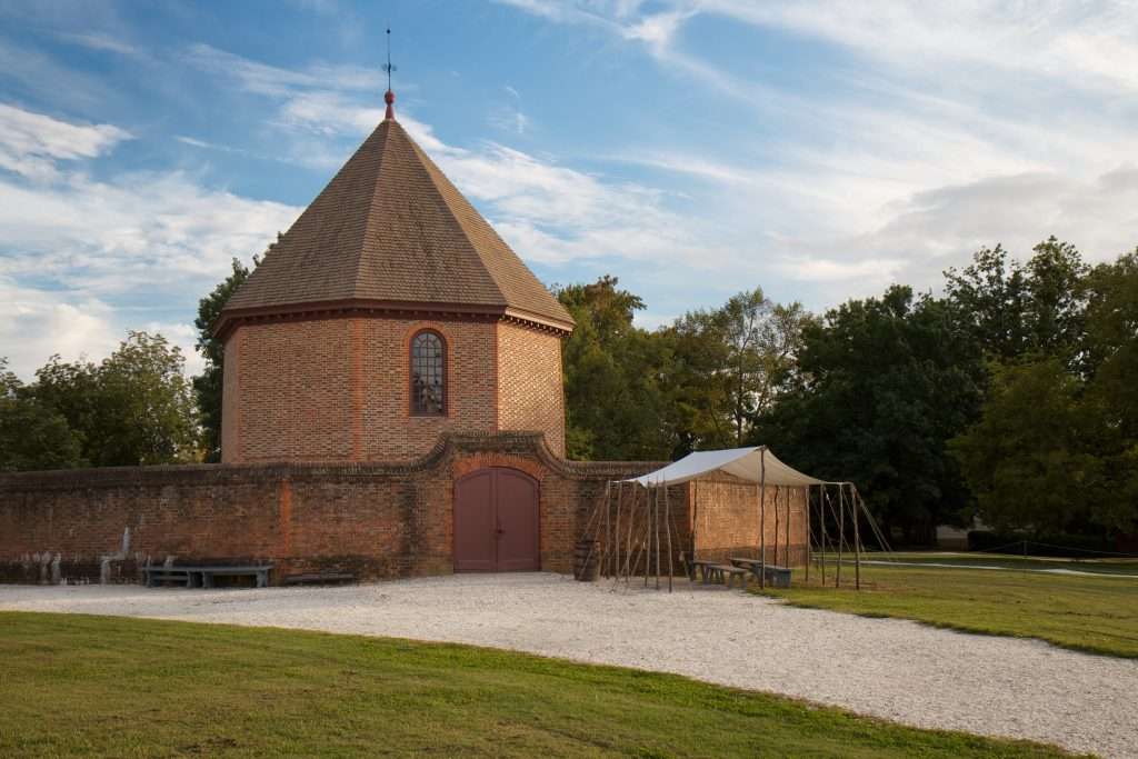 John then explained the work he has been conducting analyzing glass remnants from earlier windows at Colonial Williamsburg’s Powder Magazine (shown in the photo). Like any good mystery dinner, attendees were giving information about the evidence (glass fragments) and then asked to determine the origin of these earlier windows. It was a great way to learn about both glass and colonial history.